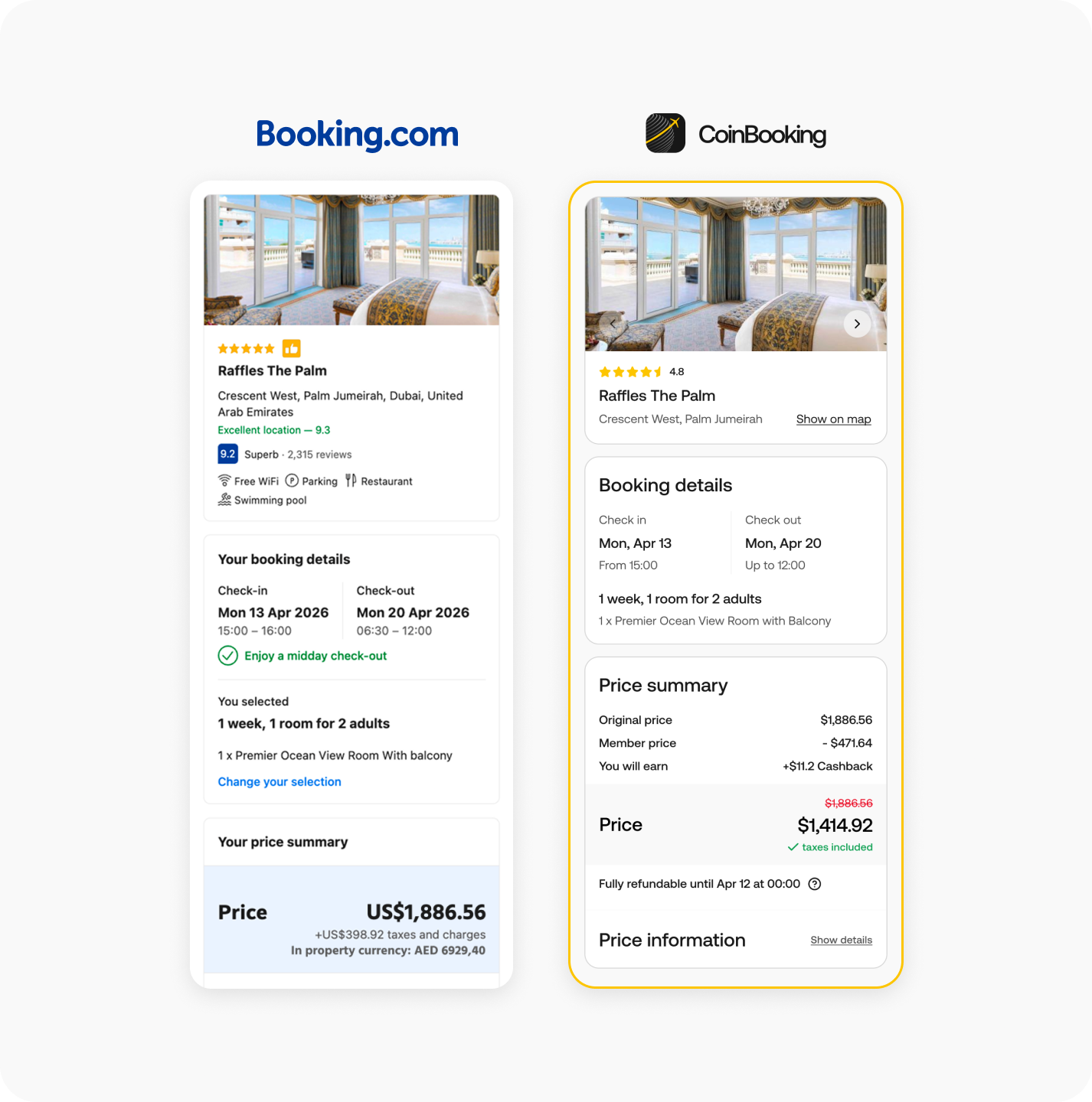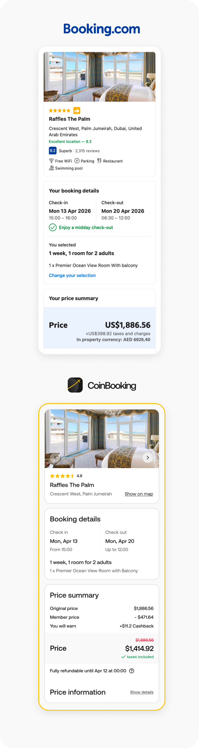 A promotion your audience will actually love. Same hotel. Same dates. This is what they pay on Booking.com, and what they see through your link.