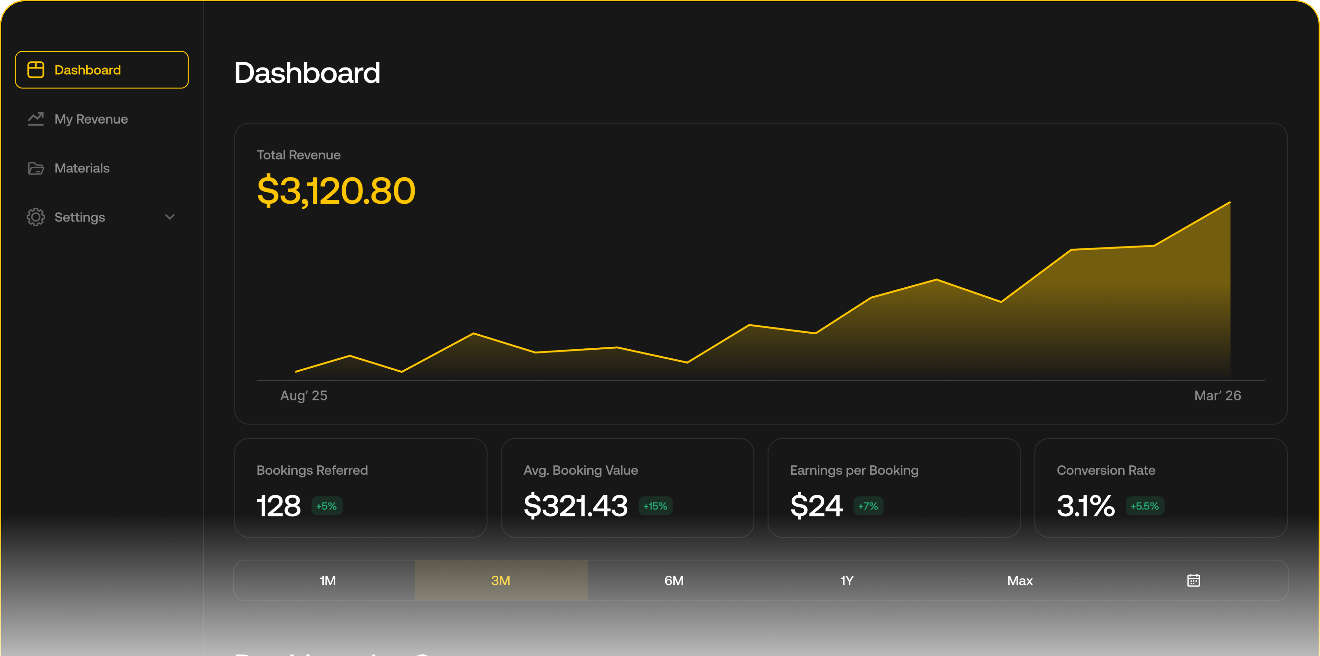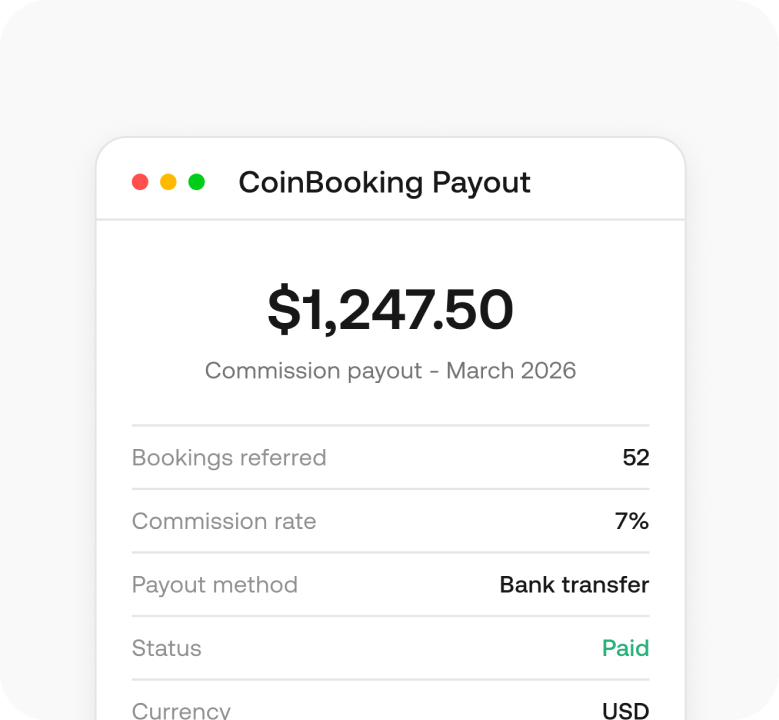 No pre-approvals. No follower minimum. Apply to become an affiliate and get instant access everything through CoinBooking's affiliate dashboard, ready-to-go promotional assets, and tracking tools.